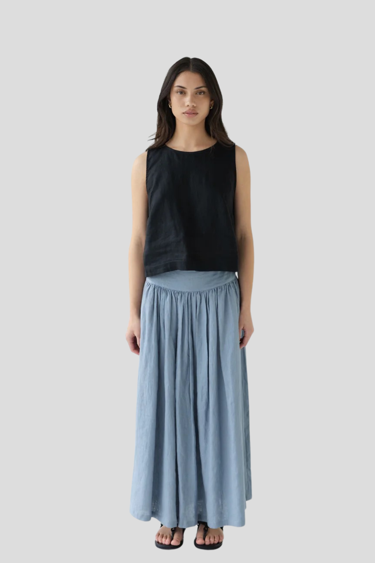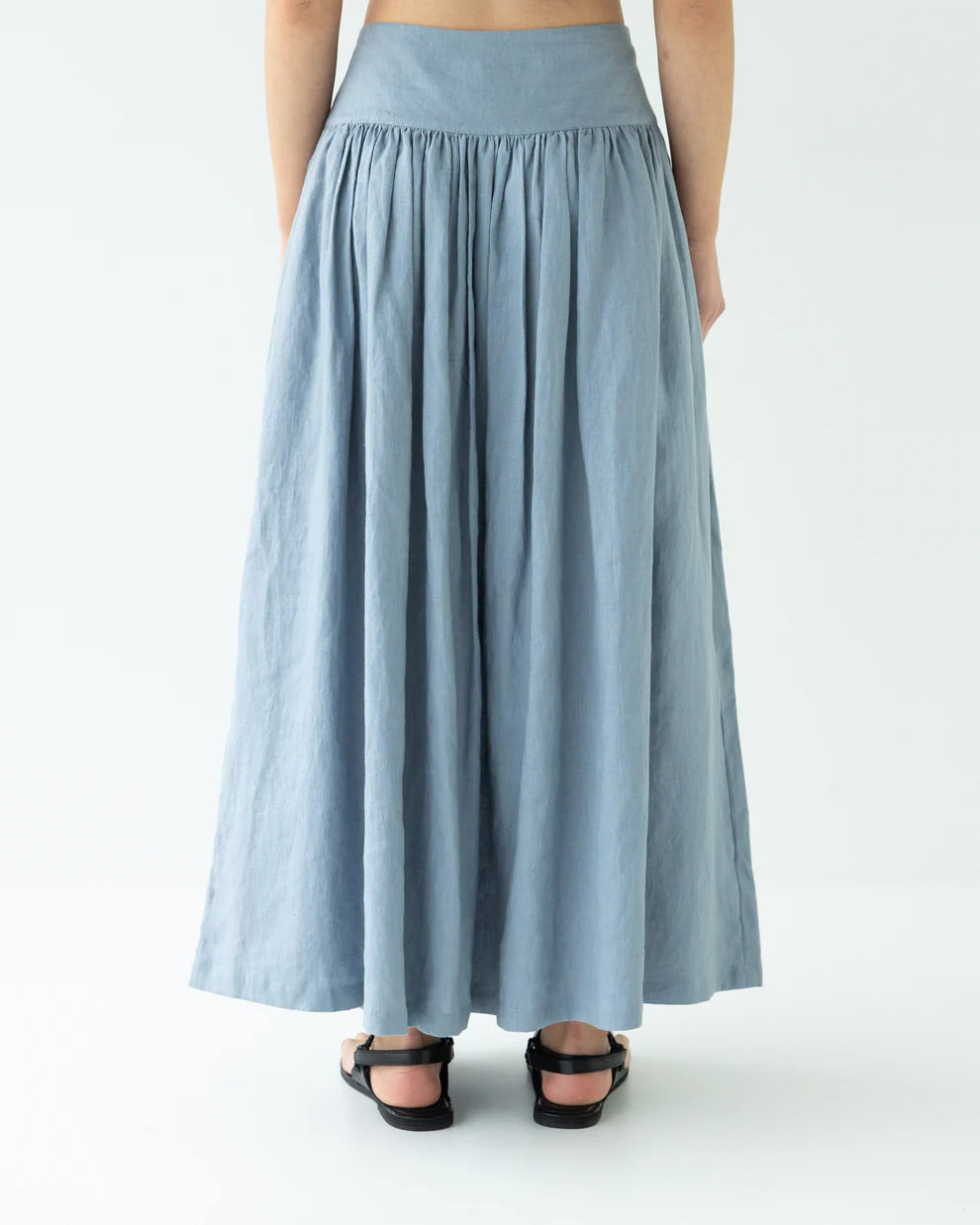 This super popular Sophie skirt returns in a lovely light blue mist colour. A gathered skirt with fullness held together with a flattering wide waistband. It is enclosed using an invisible zip at the side seam, featuring side pockets for ease & comfort. Beach, BBQ, t, blazer, sorted!