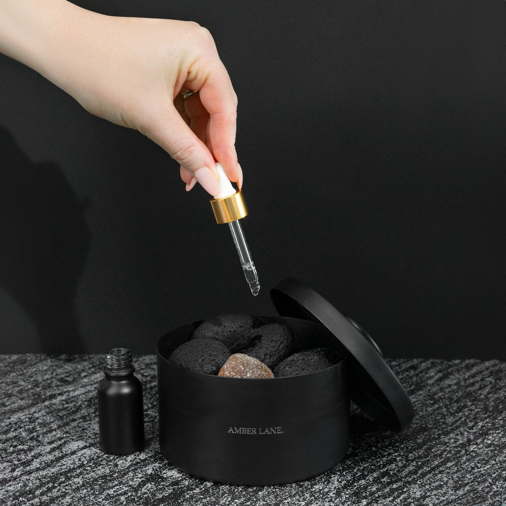 Sweet and Smokey. Honey notes blended with tobacco leaf and wildflowers, settling onto a soft amber and musk base. Our Lava Rock Home Diffusers are a stylish and innovative way to infuse your space with beautiful aromas. Housed in a bespoke black metal vessel, porous natural lava rocks absorb and release fragrance, finished with our signature raw Amber rock giving a touch of rustic elegance to any room . Lava Rocks are Mother Natures grounding stone, providing healing and energising properties. With their versatility and sustainability they can be re-used time again. No more messy reeds, burning or nasty carrier oils. They can be placed anywhere in your home, simply add a few drops of your desired fragrance oil onto the lava rocks, and let the scent fill your space. Amber Lane Lava Rock Diffusers offer a harmonious blend of aesthetics and aromatherapy, making them a perfect addition to any home.