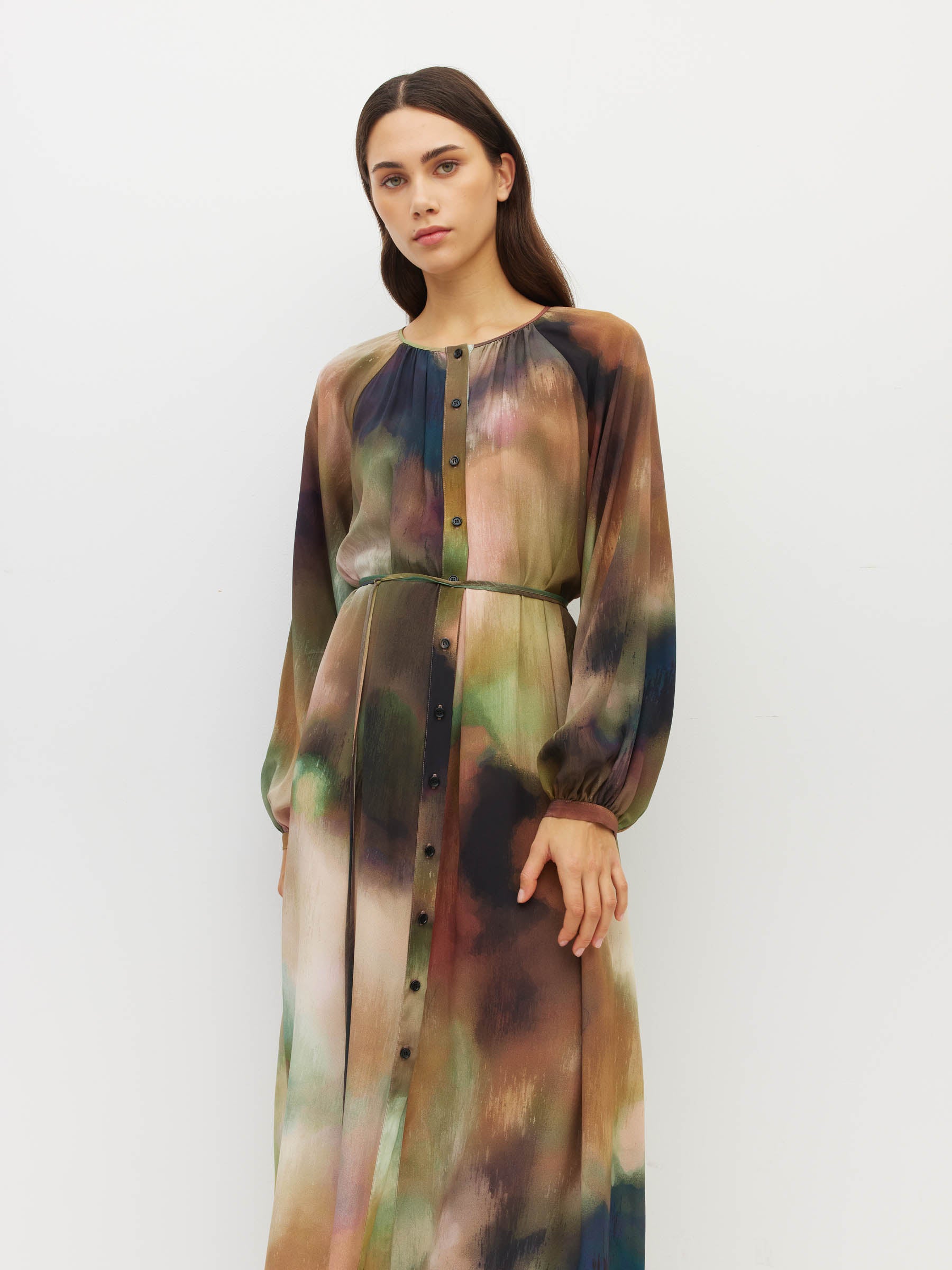 A sell-out style, the Tuscany Dress is a full-length button-up dress featuring loose full length sleeves and an optional waist tie. A firm JH favourite, the Tuscany is a trans seasonal style that pairs easily with sandals or boots and a coat. Now available in our custom Solara Grand Silk CDC.