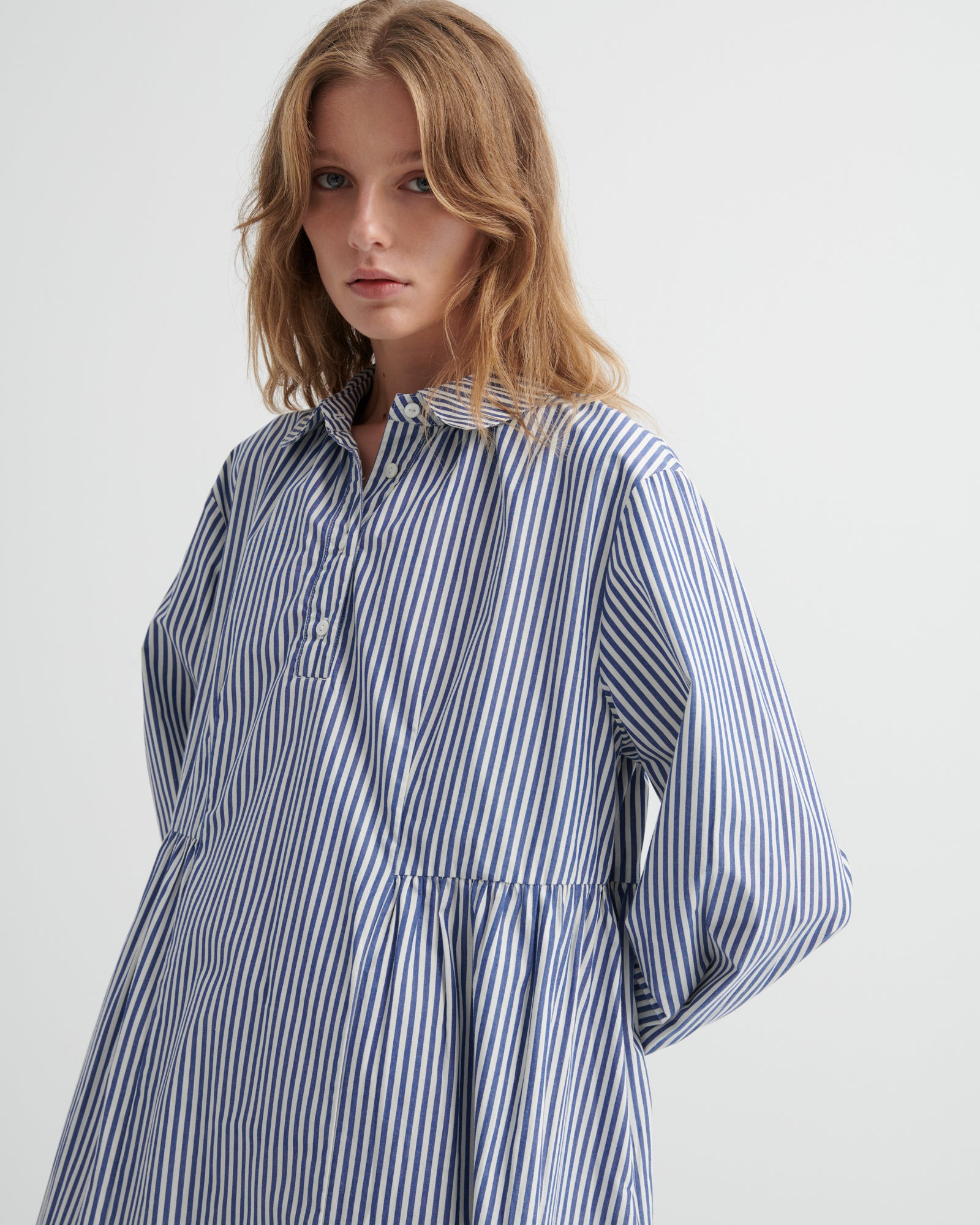 The Sonnet Dress is a classic shirt dress with a boxy, oversized fit made from organic poplin in a blue and white stripe. Gathered at the side of the waist with a full skirt that falls to midi-length. It has a curved collar, inseam pockets and gathered full length sleeves with button cuffs. Finished with Agoya shell buttons. All Fairtrade organic cotton. All plastic-free.