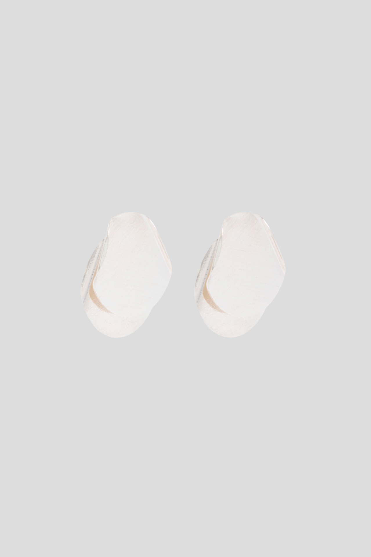 Two sculptural, petal-like shapes with Slight folds are Crafted from Thin shiny metal -textural element provided by Slight crosshatching drilled unto surface -interesting backing element where post and backing are affixed unto the Top and bottom piece creating a unique layering element when worn -comes in versatile Gold and Silver