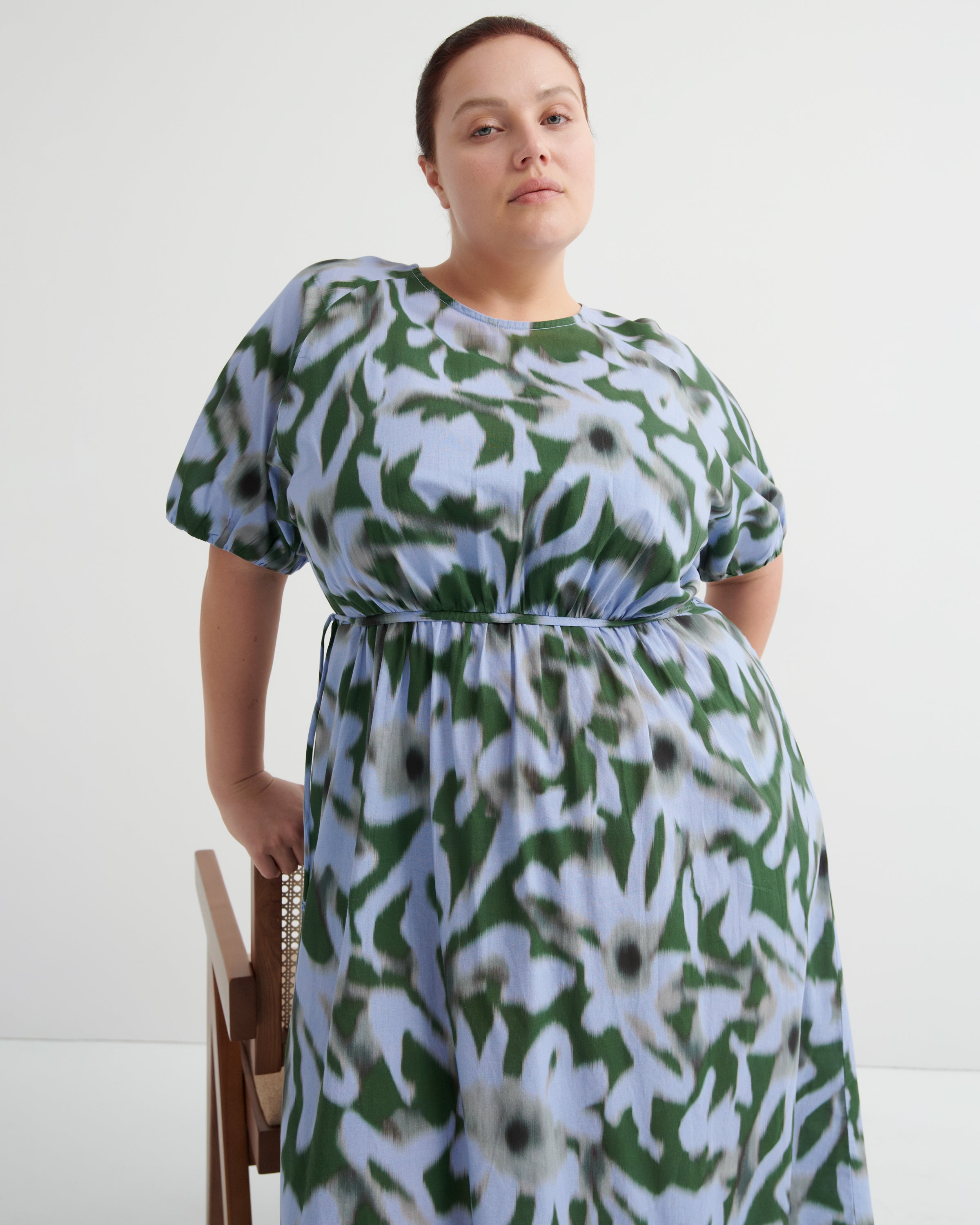 The Illustrate Dress is a midi-length style with a soft, gathered silhouette and standard fit. A delicate drawstring allows for subtle shaping at the waist, while raglan sleeves and in-seam pockets offer ease and comfort. Fastens at the back neck with a single agoya shell button. Crafted from lightweight organic cotton voile, printed in Misty Floral — a traditional Ikat-inspired design. All Fairtrade organic cotton. All plastic-free.