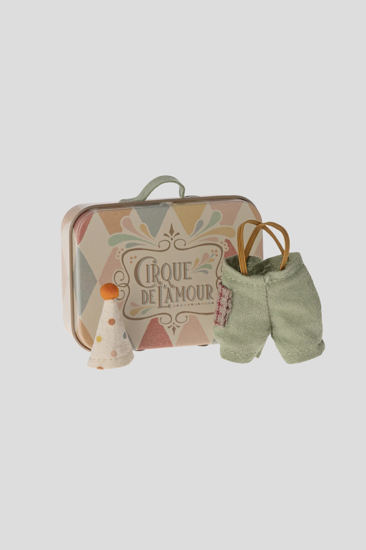 Dress up your little brother mouse in this playful set of clown clothes. Includes pants with suspenders and hat - all packed in a small metal suitcase so it is easy to bring on the go. Suitcase measures H6.5cm x W7.5cm x D2.5cm.