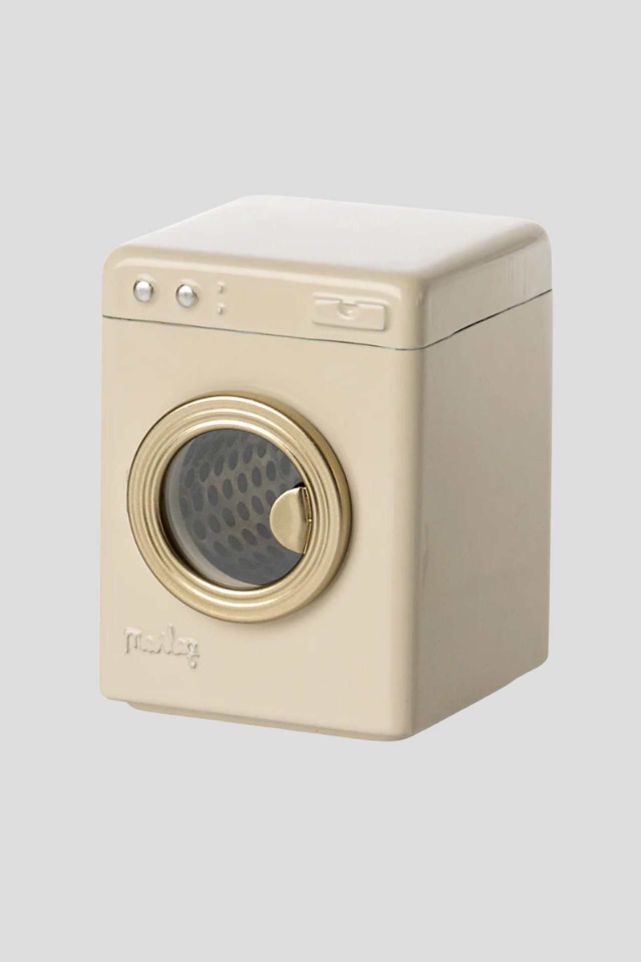 Every busy Maileg household needs a washing machine. Painted metal in an off-white colour. Measures 8.5cm (H) x 6.5cm (W).