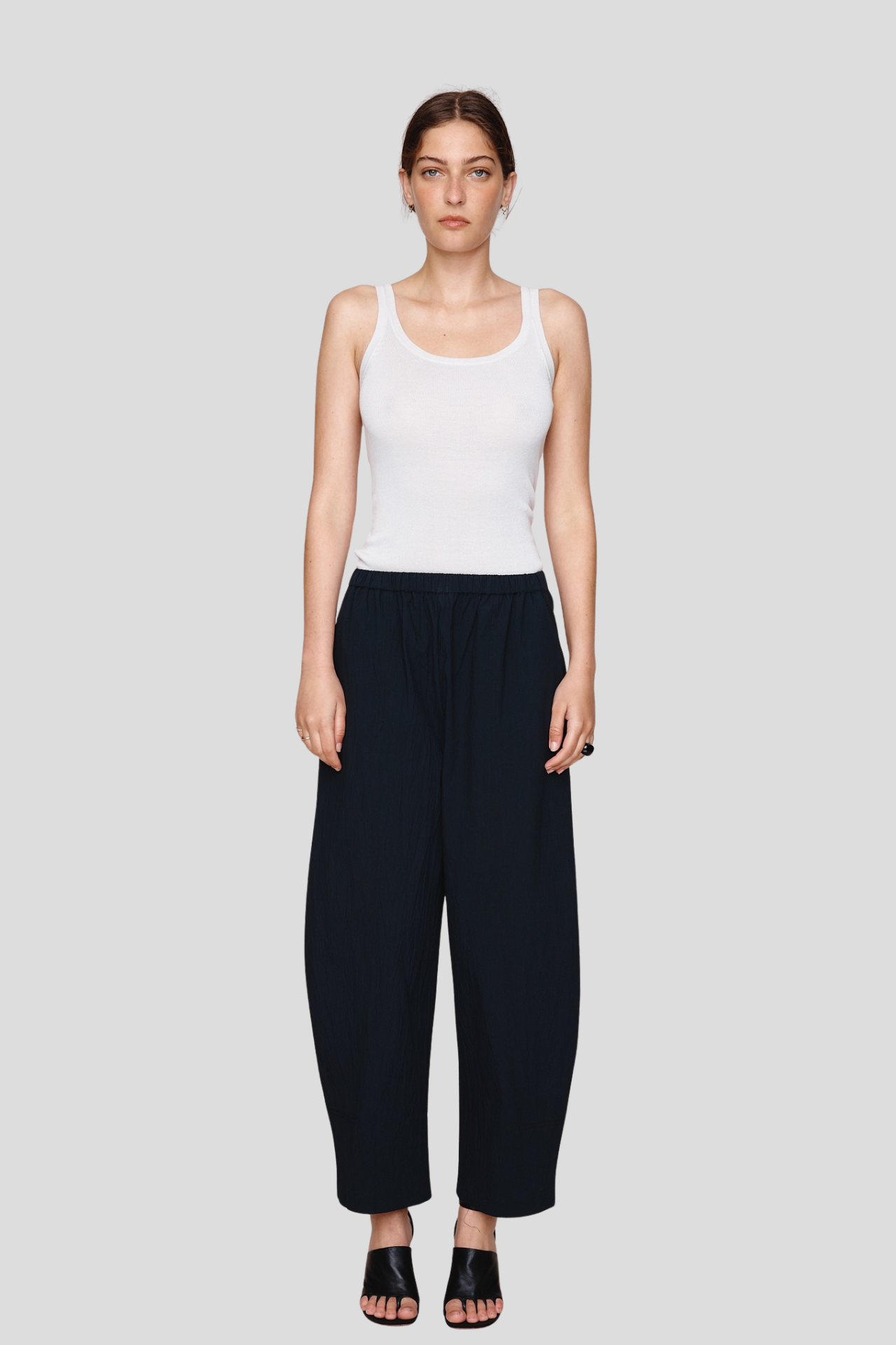 The Wilken pants are crafted from a lightweight, textured 100% cotton with a softly crinkled finish. They feature a relaxed shape with a full, rounded leg that tapers gently towards the hem, creating an elegant yet effortless shape. Designed with comfort in mind, they have an elasticated waistband for an easy fit and subtle side seam pockets for everyday wear. A refined, elevated essential that pairs seamlessly with both structured and soft separates.