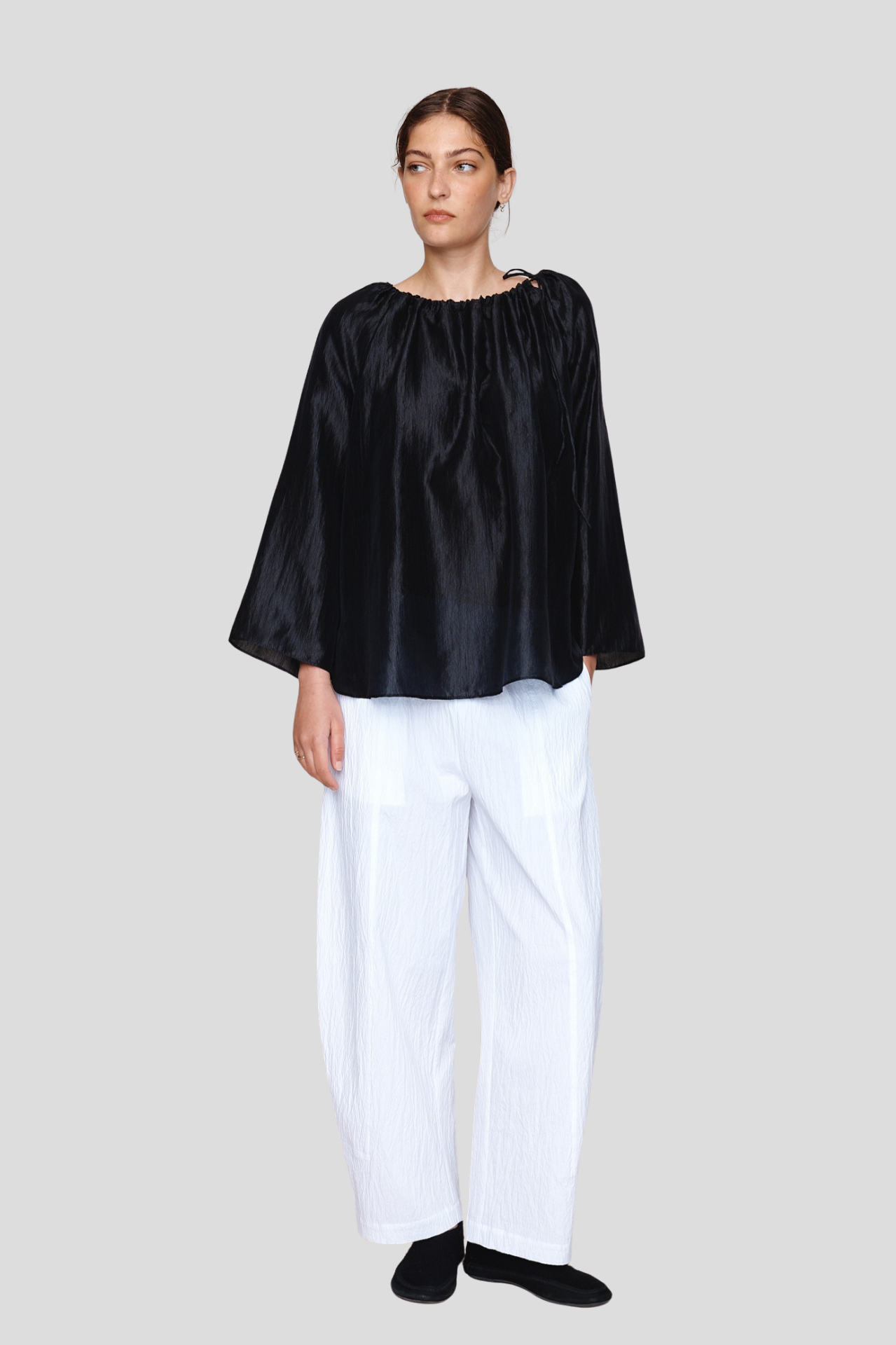 A relaxed, voluminous shape with a gathered neckline finished with adjustable ties that allow the fit to be customised. The full, wide sleeves fall to the wrist with an effortless drape and subtle gathers through the front and back create a gentle, rounded shape. Finished with a curved hem, this top offers ease and movement while maintaining a clean, minimal aesthetic.