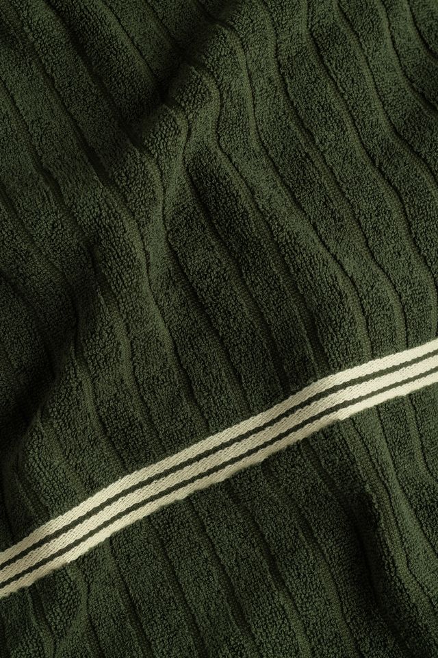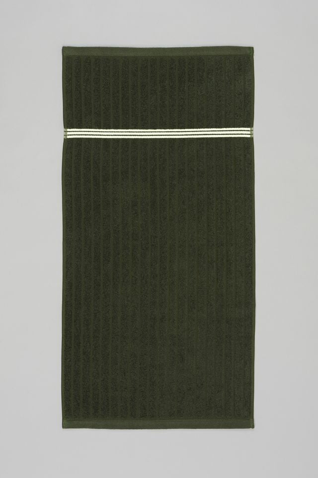 100% Organic Cotton hand towel with a luxuriously soft handle. Reminiscent of heritage club rooms, this towel is defined by textural moss rib accented by three crème stripes. Inspired by the spaces where an individual sits, inwardly connected to, the post-match exhale. The Emerald pairs nicely with the ST BATHANS bath towel.