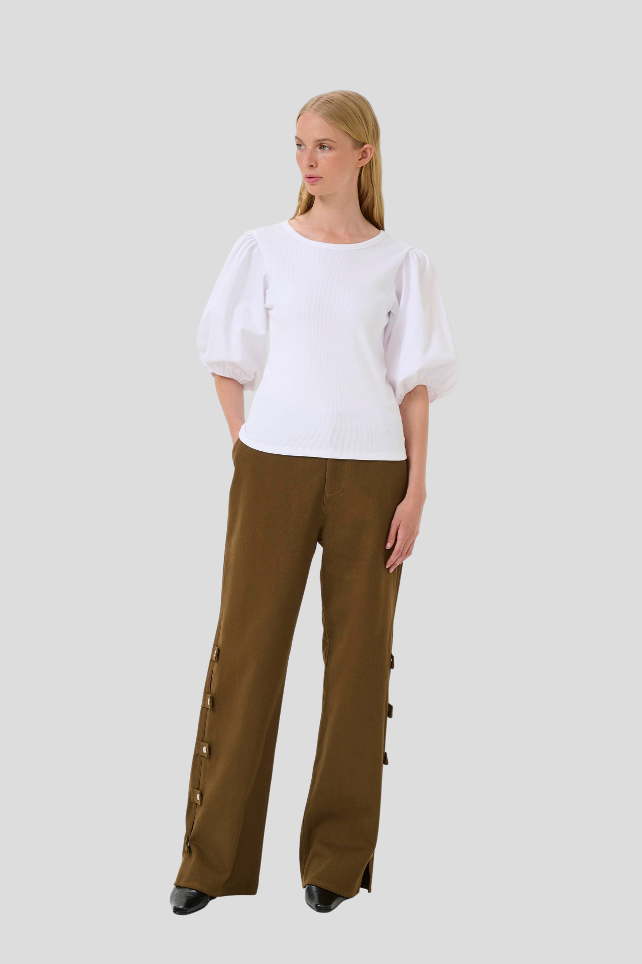 Women's top with regular fit combines soft stretch fabric and dramatic puff sleeves for contemporary elegance. Features a round neckline and short length for versatile styling and comfort.