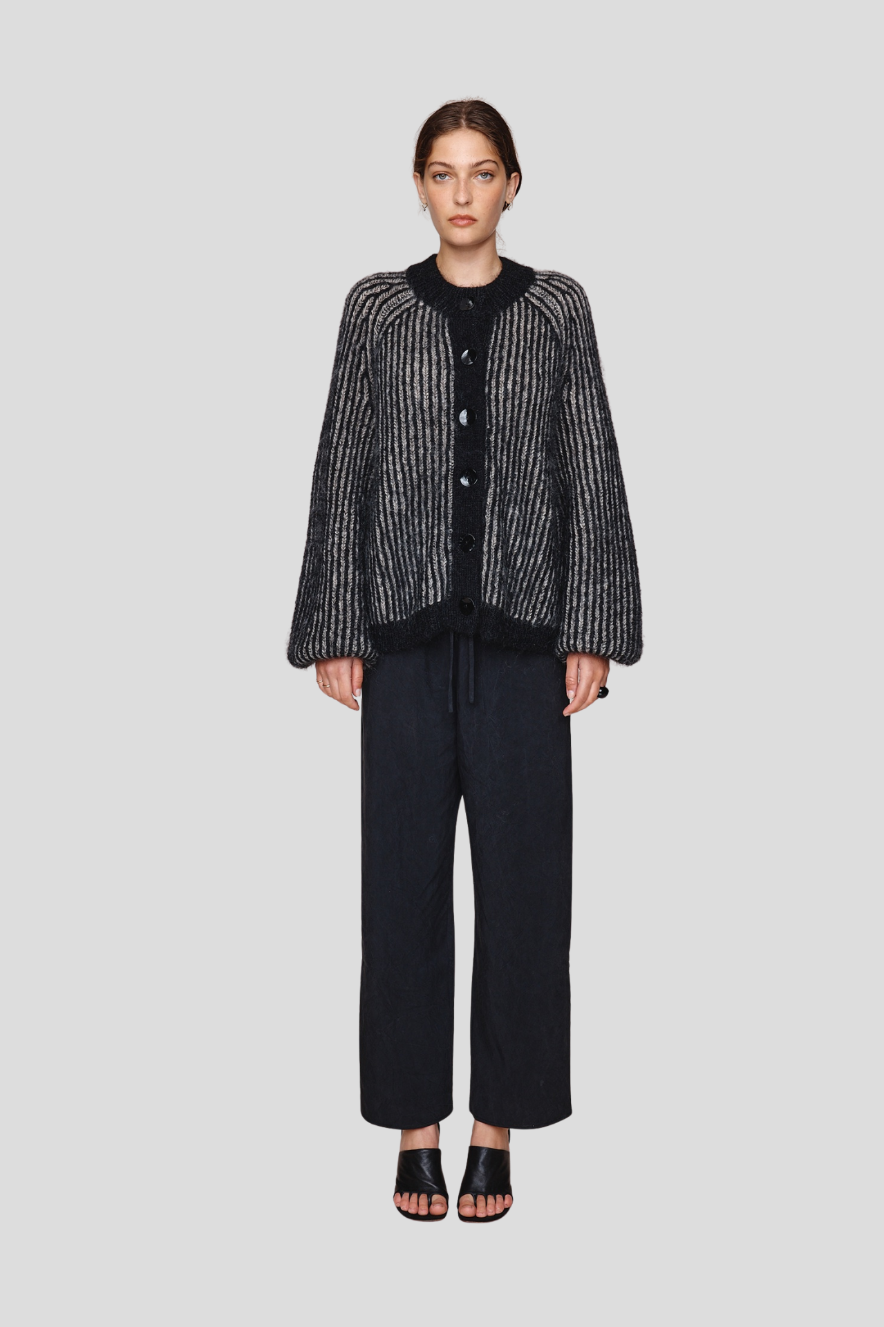 The Jasper cardigan in mohair–merino is a updated version of the Marle Cait Cardigan. With a fisherman rib stitch, relaxed oversized fit, elongated body, balloon sleeves, high ribbed neckline, ribbed cuffs, and oversized shell buttons through the centre front.