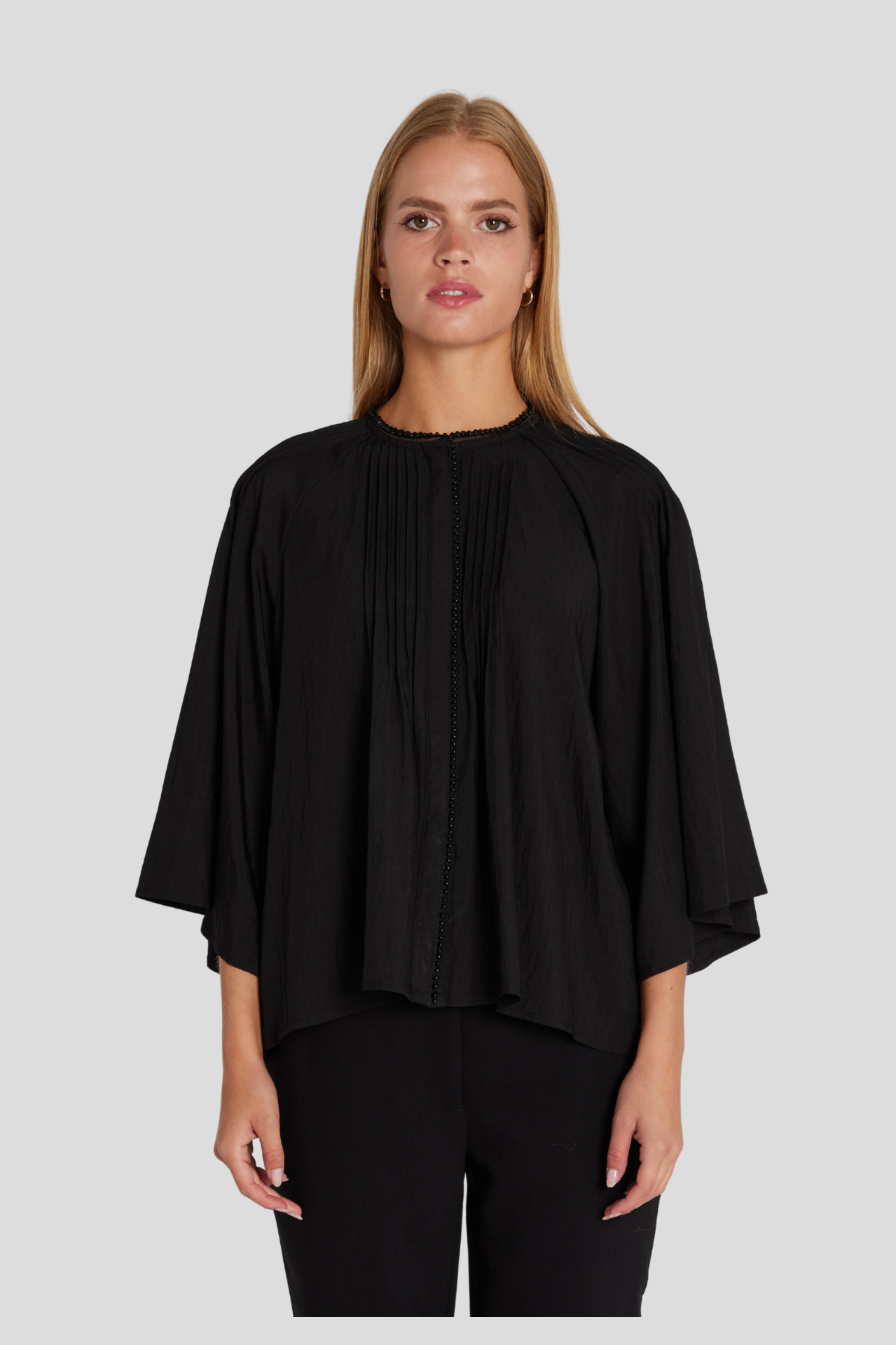 Kassia is a feminine shirt with a loose silhouette, wide three-quarter sleeves and fine pleats at the front and back.