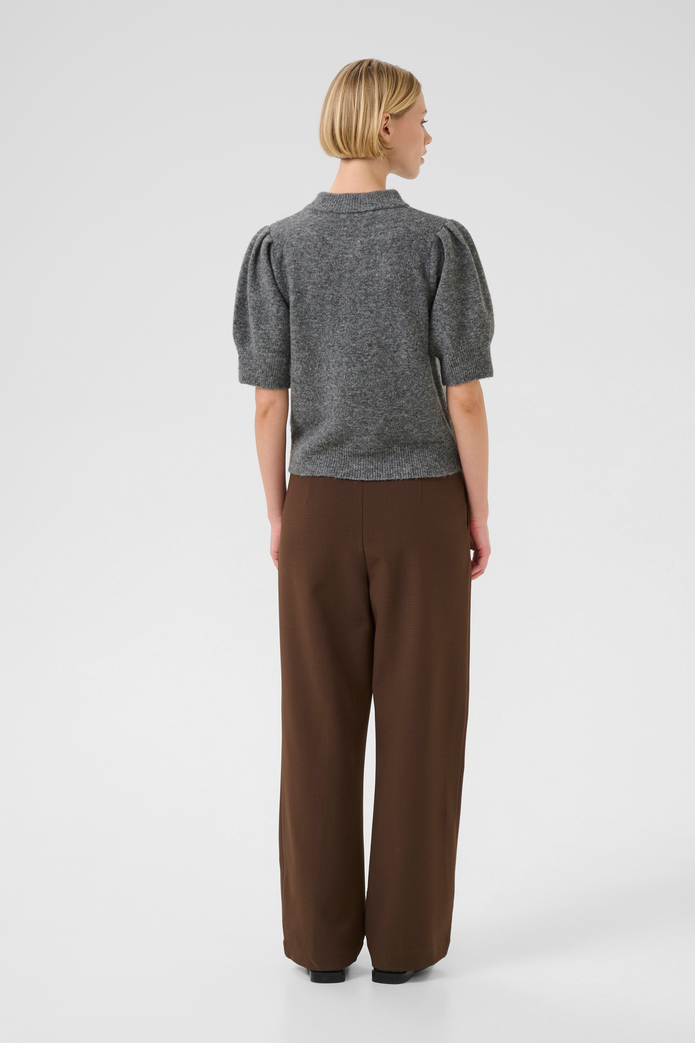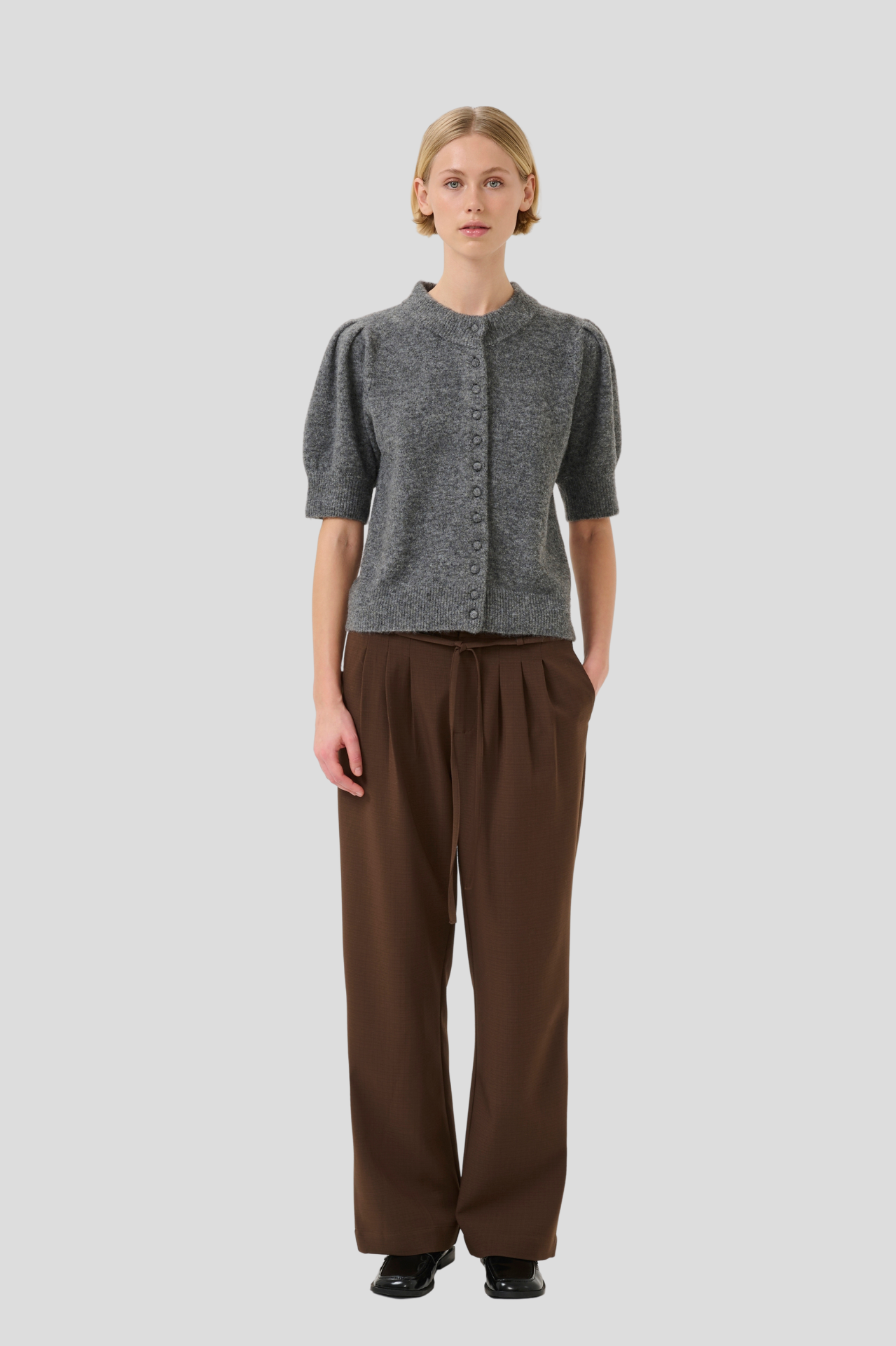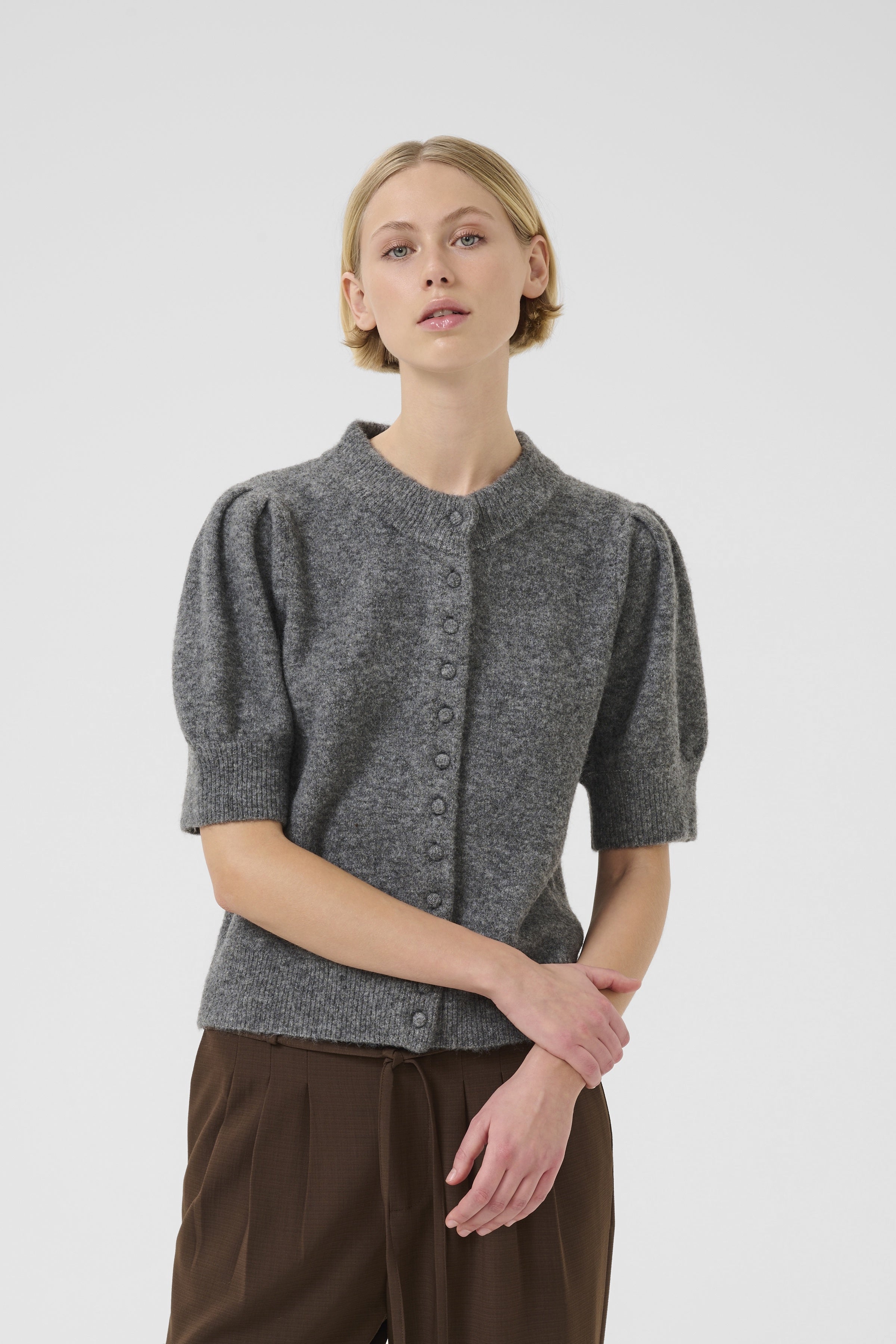 This short-sleeve cardigan offers a relaxed silhouette, soft knit comfort, and a button-front closure, making it a versatile choice for layering. The round neckline and gentle structure suit both casual and work settings.