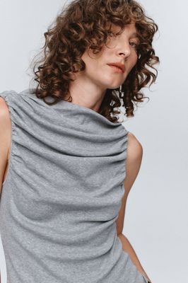 A refined take on the sleeveless top, the Risa Singlet is crafted from a soft stretch 100% Cotton jersey. Featuring an artfully draped neckline and armhole at the front and back that creates soft folds, adding quiet structure to an otherwise pared-back shape. Cut close through the body for a clean fit, it balances elegance with simplicity. A versatile base layer or stand-alone piece with a sculptural edge.