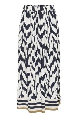 Maxi skirt in black and off-white abstract print with a striped border in black, white, and khaki. Designed with a comfortable elastic waistband and a flowy, pleated silhouette. Made in lightweight woven fabric.