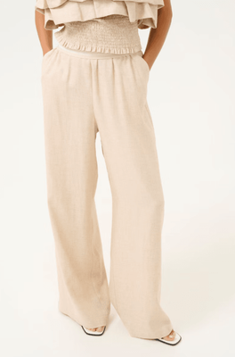 Wide-leg pants feature a flowing straight silhouette with a soft, lightly textured finish. High-rise elastic waistband offers a comfortable, flattering fit for effortless style.