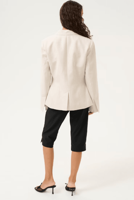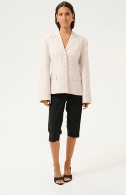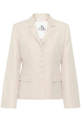 Tailored blazer with a structured silhouette, featuring a notched collar, covered button closure, flap pockets, and long sleeves. Subtle texture adds depth to its sharp look.