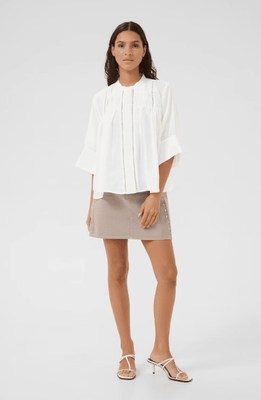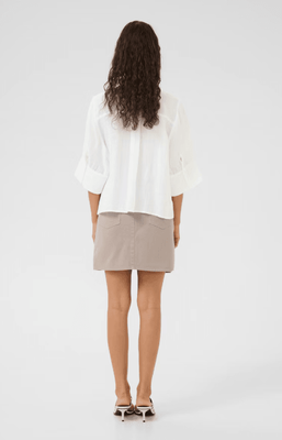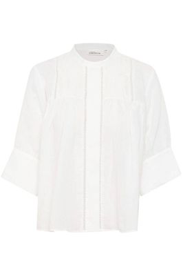 Boxy blouse with a soft finish, featuring a round neckline, vertical panel detailing, and wide 3/4 sleeves with large cuffs. Breezy silhouette for an effortless statement.