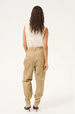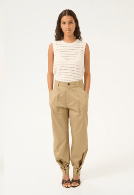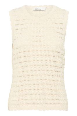 Sleeveless crochet top with a round neckline and straight silhouette. Features delicate openwork texture and scalloped edges at the hem and arm openings.