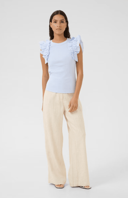 Ribbed cotton top with decorative ruffles on the shoulders. A feminine upgrade of a classic basic – perfect with jeans, shorts or skirts.