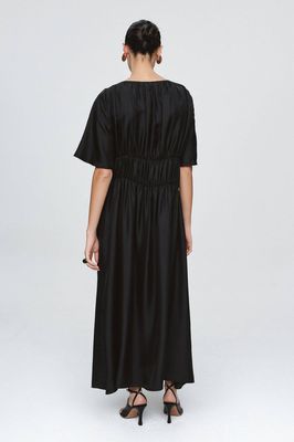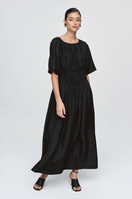 The Dieter Dress is cut from 100% Tencel, offering a soft, sustainable drape with a subtle sheen. Designed with gathered elasticated channels across the bodice and waist, it creates a softly defined shape while maintaining comfort and ease of movement. The round neckline and wide short sleeves lend a relaxed balance to the sculpted midsection, while the full skirt falls to mid-calf, moving fluidly with the body.