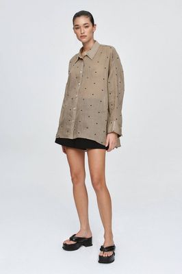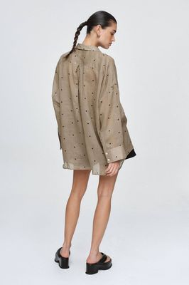 The perfect oversized shirt, this edition of the Edie is crafted from semi-sheer Ramie cloth, offering a soft yet structured hand feel. The fabric is delicately woven with a contrasting black square dot motif. Designed with a standard collar and a button-down front finished with natural shell buttons, it features an oversized, boxy shape that falls slightly longer at the back. Wide, long sleeves complete the relaxed look, detailed with two shell buttons at each cuff for a refined finish.