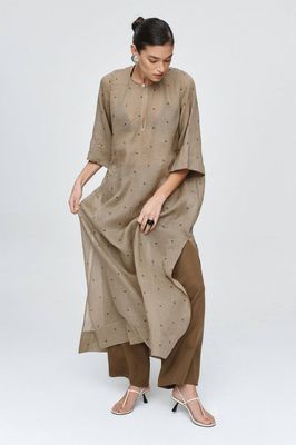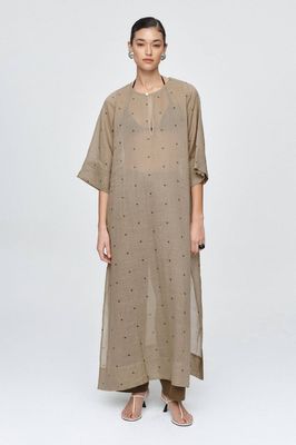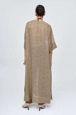 A fluid kaftan cut in a semi-sheer 100% Ramie cloth, offering a soft yet structured hand feel. The fabric is delicately woven with a contrasting black square dot motif. Designed with a clean, round neckline and a discreet front neck slit secured by a single button. A panelled hemline adds subtle weight and shape with side seam slits to create movement and soft volume. Unlined for a light, breathable feel, it is intended to layer over swimwear or fine base garments.