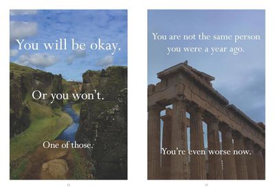 This abundance of wisdom is helpfully organized into eight everyday subjects on which we can all use a little subversive sympathetic enlightenment (including Daily Motivation, Work, Success, and Other People). Dave excavates each subject further in a funny, clear-eyed short essay. All photos are his own. All feelings widely shared.