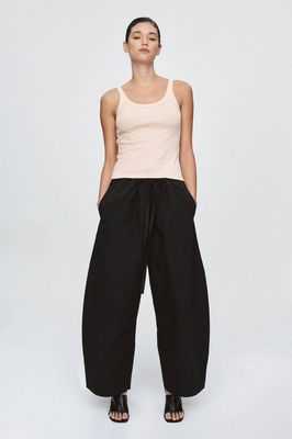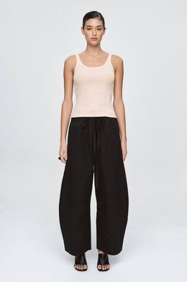 The Aden Pant is cut from a crisp 100% Cotton, offering light structure and a smooth hand feel. Designed with a voluminous full length barrel leg, it features a drawstring waistband with a self-fabric tie threaded through a clean channel, allowing for adjustability and comfort. The pant includes side seam pockets and a deep hem panel to provide subtle weight. The overall fit is relaxed through the hip and leg, tapering slightly at the hem for balance.