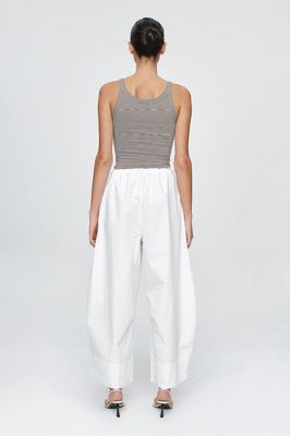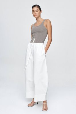 The Aden Pant is cut from a crisp 100% Cotton, offering light structure and a smooth hand feel. Designed with a voluminous full length barrel leg, it features a drawstring waistband with a self-fabric tie threaded through a clean channel, allowing for adjustability and comfort. The pant includes side seam pockets and a deep hem panel to provide subtle weight. The overall fit is relaxed through the hip and leg, tapering slightly at the hem for balance.