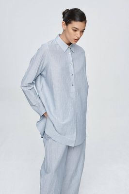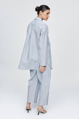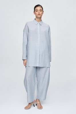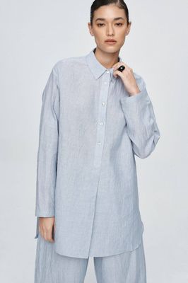The Anders Dress is crafted in a lightweight cotton / linen cloth. It features a structured collar and a 5 button placket at the centre front for a clean, uninterrupted line. Set-in sleeves that fall to a hemmed cuff enhance the relaxed fit, while the curved hemline softens the shape and invites layering. Side seams include splits for movement and comfort, while the back features a box pleat set into a yoke for added volume through the body.