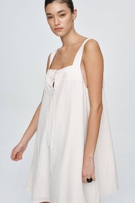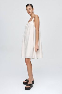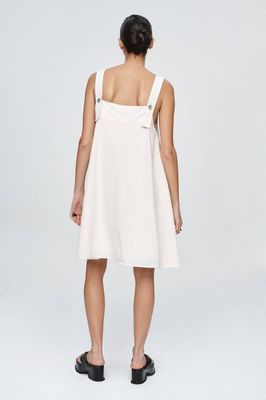 The Dodi Dress is crafted from 100% cotton with a soft yet structured hand feel. Echoing the signature lines of the Dodi Top, the dress features a square neckline and wide straps that extend over the shoulders, fastening at the back with buttoned tabs. Falling to the knees, the Dodi Dress maintains a voluminous A-line shape that moves fluidly away from the body. A centre-front split opening with a rouleau tie closure punctuates the neckline, offering subtle adjustability.