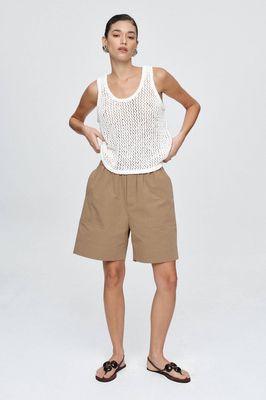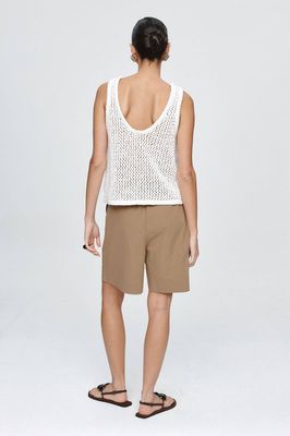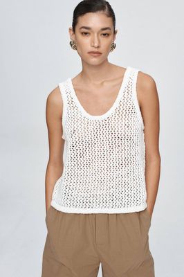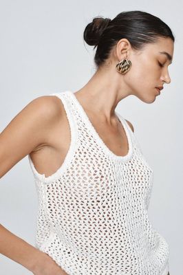 The Nova Top is crafted in 100% Cotton, offering a textured open knit. Designed with a scooped neckline at the front and back, it falls to a relaxed, boxy shape that layers effortlessly over simple foundations. The deliberate looseness of the weave creates an airy, unstructured quality.
