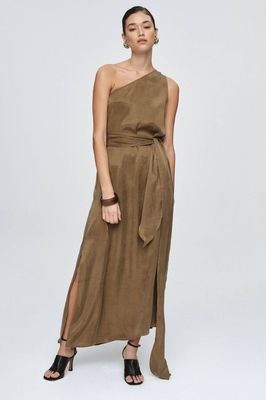 The Rosa Dress is cut from a soft blend of 80% Tencel and 20% Linen, combining fluid drape with natural texture. It features an asymmetric one-shoulder neckline with an extended shoulder panel that cascades down the front or back for soft movement and dimension. The relaxed column shape skims the body, complemented by an optional self-fabric belt that defines the waist. Finished with side splits for ease of wear and movement.