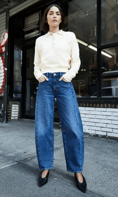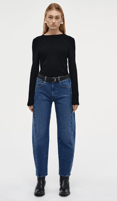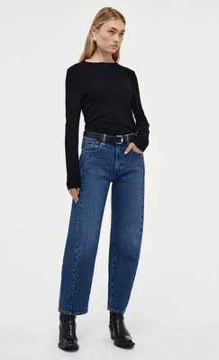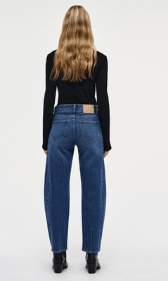 A mid rise slim fit barrel leg jean that sits at the ankle