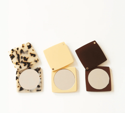 Sweet portable mirror, folds away for easy storage. Perfect for on-the-go touch-ups anytime, anywhere. Comes in a cotton bag.