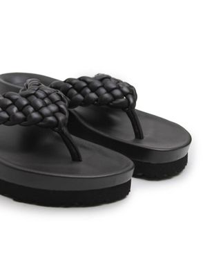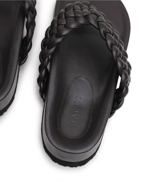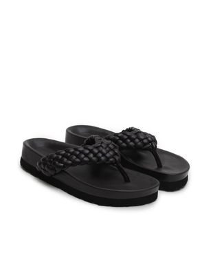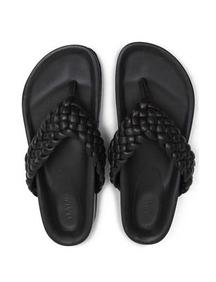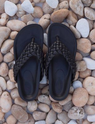 A hand braided thong strap rests on a moulded footbed. Cushioned for soft everyday wear.