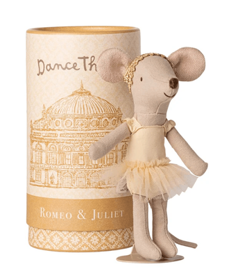 Meet the elegant Maileg Ballet Mouse – a real dancer ready to twirl her way into your heart. Dressed in a classic ballet outfit, she comes in a beautifully decorated display tube, complete with a stand so she can pirouette proudly in any room. Perfect for play, display or gifting, this graceful mouse adds a touch of magic to every moment. Mouse measures 13cm in length.