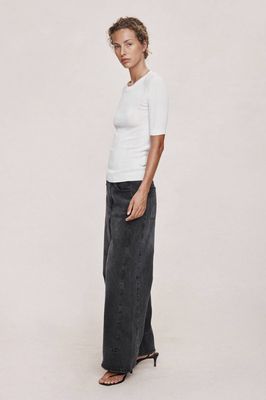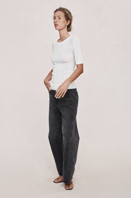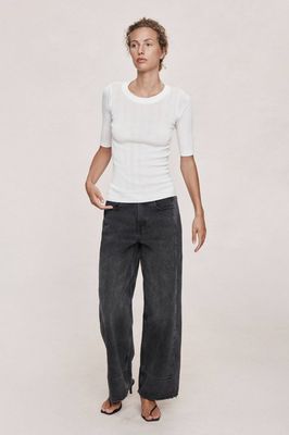 This short-sleeve knit top is crafted from a fine ribbed fabric that offers soft stretch and a smooth, body-skimming fit. Designed with a classic crew neckline, it features elbow-length sleeves that create a refined, elongated proportion. The vertical rib structure provides subtle texture and natural elasticity, ensuring comfort while maintaining a clean, minimal shape. An elevated everyday essential for layering or wearing on its own.