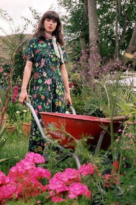 Are you here for the garden tour? The Madeleine dress is a long, simple, silk dress with round neck, short sleeves and bias-cut skirt with waist ties. Cut in our custom 100% silk crepe de chine.
