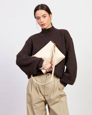 The detailed chain adds an elegant edge to her silhouette, while the versatile strap means you can wear her crossbody for hands-free ease or remove it entirely to carry her as a sleek clutch for evening. One bag, endless styling possibilities.