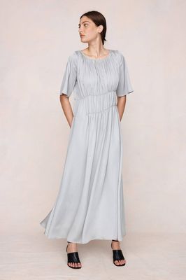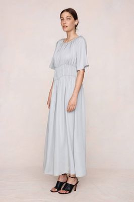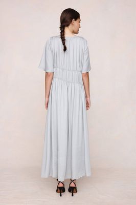 The Dieter Dress in 100% Tencel with a fluid drape, round neckline, wide short sleeves, gathered elasticated channels through the bodice and waist, and an ankle-length hem.
