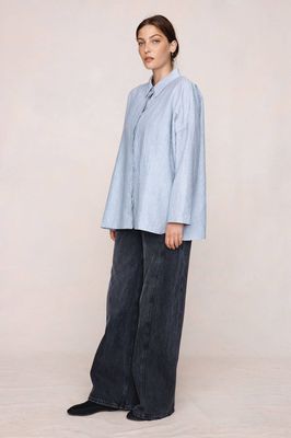 This long-sleeve shirt is crafted from a lightweight, textured linen / cotton blend that offers a soft, airy drape. Designed with an intentionally oversized shape, it features a classic pointed collar with a concealed button placket for a clean, minimal finish. The wide, gently flared shape through the body creates ease and movement, while dropped shoulders enhance the relaxed fit. At the back, a deep inverted pleat adds volume and structure. Finished with long sleeves and tonal buttoned cuffs, this piece is an elevated wardrobe staple ideal for effortless layering.