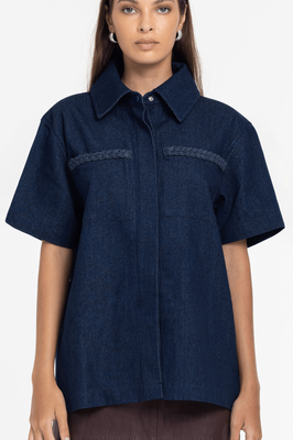 A modern take on denim dressing, the Edwin Shirt brings sharp structure with an easy, wearable drape. Cut in a rich dark indigo, it features a clean collared neckline, short sleeves, and a longer length that works beautifully worn loose or lightly tucked. The braided trim detail adds a refined, textural finish—subtle, elevated, and very BLAK. Pair with leather-look minis for contrast or keep it tonal with denim-on-denim.