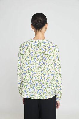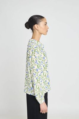 The Leela blouse is cut in decadent custom print silk crepe de chine. With long sleeves, a flat scalloped collar, gathered sleeves at cuff, and front placket.