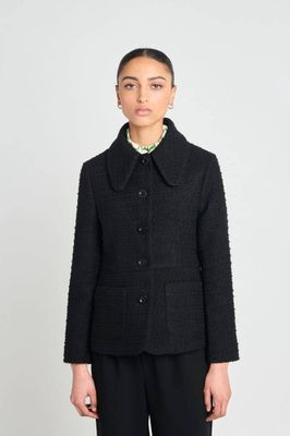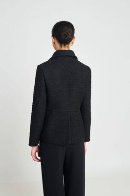 Work or weekend is no challenge for this little wool bouclé blazer. Fully lined, with button closure, exaggerated collar, patch pockets and back vent.