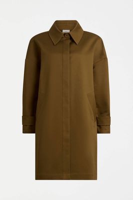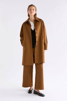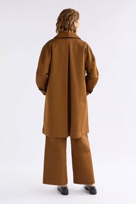The Talli Jacket is a longline style crafted from a midweight, structured organic cotton stretch twill. This regular fit jacket features a classic shirt-style collar, centre front placket with concealed Corozo button closure, and dropped shoulder seams. The long sleeves have adjustable cuff tabs with decorative box pleats at the outer sleeve for added volume and interest. Vertical angled front welt pockets and a back yoke with inverted box pleat create a clean, tailored silhouette. Pair with the Talli Pant for a coordinated ensemble or over your favourite autumn-winter, smart casual outfits.
